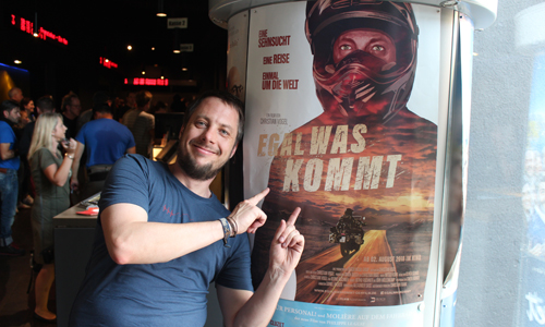 So hielt er bei allem, was er rund um den Globus erlebte, immer die Kamera und die GoPro drauf, filmte auch dann, wenn es eigentlich gar nicht erlaubt war. Beispielsweise bei seiner Durchquerung Chinas, für die ihm ein Aufpasser zur Seite gestellt wurde, ohne den er keinen einzigen Schritt unternehmen durfte. Fotos zu machen wäre in den meisten Fällen okay gewesen, deswegen benutzte Christian Vogel eine Kamera, die wie ein Fotoapparat aussah. Seine GoPro war dermaßen dreckig und verklebt, dass er sie oftmals einfach mitlaufen ließ, ohne dass sein Gegenüber davon etwas bemerkte. Wahrscheinlich hätte er großen Ärger bekommen, wenn das herausgekommen wäre, aber in Köln meinte der Filmemacher lapidar: „Ich hatte in der Hinsicht einfach viel Schwein.“ Erst ein halbes Jahr, nachdem er wieder in Deutschland gelandet war, formte sich schließlich die Idee, mehr mit dem Material zu machen und daraus vielleicht sogar einen Dokumentarfilm fürs Kino zu zimmern. Vogel sah sich dabei einem Rohmaterialwust von 650 Stunden gegenüber, den er schließlich stets nach Feierabend sichtete und deswegen schon wenige Tage nach seiner selbstverordneten Auszeit wieder in Arbeit erstickte, obwohl er viel lieber einfach wieder auf sein Motorrad gestiegen und auf eine neue Tour aufgebrochen wäre. Auch jetzt sei an eine zweite Weltreise noch lange nicht zu denken, weil der Kinostart von „Egal was kommt“ und die damit einhergehende Premierentour den Weltenbummler zeitlich geradezu überfahre.