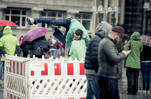 „Was ist die Stadt? Was ist eine Gemeinschaft und welche Aufgabe hat die Architektur?“, das sind die Fragen, die Thiersch ins Zentrum der Aktion rückt. Morgens geht es im Rheinpark mit einem Frühstück, ersten Tänzen und Yoga, los, dann setzt der Trupp mit der Gondel auf die andere Rheinseite über. Weiter geht es am Areal des Zoos, das früher die „Goldene Ecke“ war, ein Vergnügungspark, in dem neben Tieren auch exotisch anmutende Menschen ausgestellt wurden. Auf der Grünfläche zwischen den Autotrassen laden 100 Lindy Hop-Tänzer – deren Leidenschaft einer Mischung aus Charleston und Rock’n’Roll ist – zu einem Zwischenstopp ein.