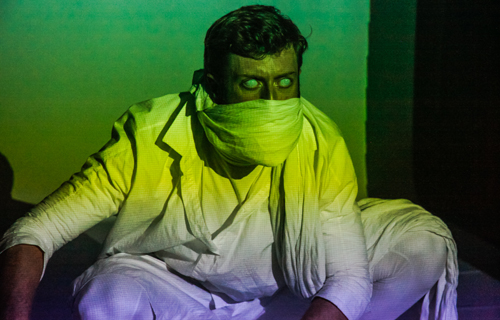 Im Mittelpunkt der Bühne steht eine Kreatur, dargestellt von Schauspieler Jordan Rountree. Komplett in weiß gehüllt, von den Schuhen bis hin zu künstlichen Linsen, wiederholt er immer gleiche Bewegungsabläufe. Zu Beginn wird zur Meditation aufgerufen: „Unser Bunker ist so gut und schön und sicher“ – man solle sich einfach entspannen und fallenlassen. Doch die vermeintliche Ruhe wird schnell unterbrochen: Zu verstörend wirken die unmenschlichen Bewegungen der Kreatur, die unruhigen Videoprojektionen und die musikalischen Störgeräusche. Dazu der „Chor der letzten Worte“, bestehend aus acht SängerInnen, der das Libretto der Amerikanerin Leslie Dunton-Downe singt, zischt und faucht.