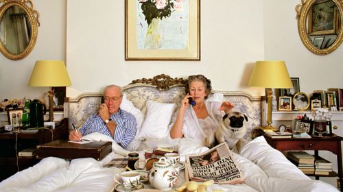 Am Anfang steht die Promi-Show-Wand. Petersburger Hängung der Schönen, der Reichen, der Berühmten. Das reicht über die Jahrzehnte von René Obermann von der Telekom über das theatrale Multitalent Robert Wilson bis zum Kontrastprogramm Nina Hagen und Günter Grass. Koelbl mag diese Kontraste, diese hinterlistige Gegenüberstellung eines Sterbehospiz in Aachen (1989) mit dem Ball des Sports in Frankfurt (1985) oder dem Bettpfannendienst eines Zivildienstleistenden in Fürstenfeldbruck (1981) mit der Fressorgie beim Festspiel in Bayreuth (1985). Auch die Behausungen in der Serie „Deutsche Wohnzimmer“ zeigen die Differenzen zwischen der unterschiedlich wahrgenommenen Realität: Da ist das schicke Interieur beim Fabrikanten, die schnöde Wohnwand im Hause des Kranführers, das vergipste Zimmer des Künstlers und die Naturholzorgie beim Juristen, schön übereinander gehängt. Und die Quersumme: Peter Handkes penibel aufgeräumtes Schreibzimmer und daneben das inspirierende Chaos bei der Dichterin Friederike Mayröcker.