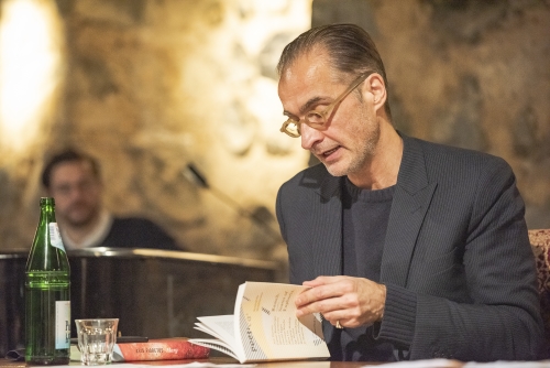 Moderiert wird der Abend von Literaturkritiker und Journalist Denis Scheck. Über den Abend hinweg setzt er gezielt Fragen und Pointen, die gut vorbereitet scheinen. Er weiß genau, was er von Aris Fioretos hören möchte, und vor allem, was er dem Publikum offenbaren will. Zu Beginn der Lesung führt Scheck in die Materie ein und kitzelt heraus, was Fioretos geprägt hat: Ihm ginge es in seinen Werken um den Puls eines Textes als körperliches Orakel – denn Literatur sei immer auch eine Frage der Verwaltung der Betroffenheit. Dass es beim Schreiben dabei um einen Ausgleich aus Innen und Außenwelt, von Kopf und Herz ginge, stünde immerfort im Mittelpunkt: „Literatur muss bewegen.“ Und das meint er wörtlich.