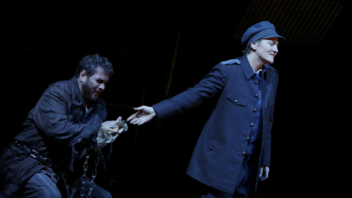 Nun ließ Hampe aber seinen Bühnenbildner Darko Petrovic eine düstere Kulisse mitsamt Kostümen anfertigen, die eine Verortung des Geschehens im europäischen Faschismus der dreißiger Jahre nahelegt. Die ohnehin heikle, zuversichtliche Auflösung des Stücks in der Apotheose des Ministers der Urfassung, erfährt in diesem Rahmen einen unglücklichen Anklang von Zynismus: Wo war damals die Obrigkeit, die die Tragödie mit einem bloßen Fingerzeig hätte verhindern können? Selbst wenn die erzeugte Disparität beabsichtigt war, so schien sie doch unzureichend erzählt. Dass ihm eine solche, nuancierte Darstellung durchaus gelingen kann, zeigt Hampe mit der Inszenierung des Kerkermeisters Rocco, den Stefan Cerny gekonnt intoniert. Zerrissen zwischen Unterwürfigkeit und Aufbegehren gegenüber Pizarro, entwickelt er sich zum reizvollsten Charakter des Abends.