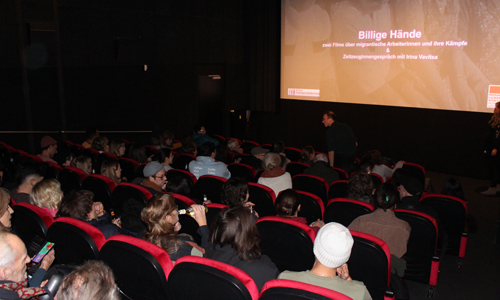 Nuria Cafaro von der Rosa-Luxemburg-Stiftung moderierte die Gesprächsrunde des Abends und präsentierte mit der in Russland geborenen Griechin Irina Vavitsa einen Stargast mit bewegter Vergangenheit. Seit 1971 lebt Vavitsa in Deutschland und hat seit dieser Zeit beim Automobilzulieferer Hella in Lippstadt gearbeitet, wo sie sich als langjährige Betriebsrätin und als Mitglied des Migrationsausschusses der IG Metall verdient gemacht hat. Obwohl sie 2016 verrentet wurde, ist Vavitsa nach wie vor gewerkschaftlich engagiert und macht sich für bessere Arbeitsbedingungen stark, insbesondere auch für migrantische ArbeiterInnen. Cafaro erläuterte, dass sie ihre aktuelle Filmreihe zum 50. Jubiläum der wilden Streiks aus dem Jahr 2023 initiiert hätten, die in Köln vor allem durch den damaligen Ford-Streik noch in guter Erinnerung sind. Diese Streiks seien „vor allem von migrantischen Arbeitskräften getragen worden, die sich so mit ihren schlechten Arbeits- und Lebensbedingungen auseinandergesetzt“ hätten. In der Diskussionsrunde mit dem Publikum wurde fast ausschließlich auf Schmidt-Marcellos Film Bezug genommen. Hinsichtlich des Films „Provisorisches Leben“ gab es allerdings die Kritik, dass die deutschen Untertitel das Serbokroatisch der Interviewten allzu wörtlich wiedergegeben hätten, wodurch der Sinn der Aussagen aber verfälscht worden sei. „Billige Hände“ stieß hingegen auch 55 Jahre nach seiner Entstehung noch auf überaus positive Resonanz. Irina Vavitsa betonte, dass alles im Film Dargestellte stimme, wie sie aus eigener Erfahrung bezeugen könne. Meldungen aus dem Kinosaal unterstrichen, wie fortschrittlich und mutig die Perspektive des Films auch für unsere Zeit noch sei.