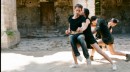 Drei Schurken in Staubmänteln schreiten über knarrende Dielen.
