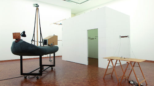 Am deutlichsten wird das vielleicht bei einer neuen Arbeit, „A good Deal“ (2012), die in einem Raum mit drei Kino-Sitzen erhaben an der Wand präsentiert ist. Ein beiger Ledersessel hängt kopfüber. Unten ist an ihm ein altmodischer Ventilator befestigt, der von einem Stück Aluminiumfolie beschirmt ist, welches sich im Gebläse aufrichtet. Oben am Stuhl ist eine Neonröhre montiert, deren Licht auf der Folie reflektiert. Alles ist in Unruhe, einzelne Teile fahren aus, seitlich hämmert im Rhythmus zur Sprache ein Stab, der Ventilator dreht sich in verschiedene Richtungen, als würde er sein Publikum fixieren. Atmosphärisch dichter Sound ist zu hören. Er schwellt an und steigert die Dramaturgie, die mit den Bewegungen und der schneidigen Stimme einhergeht. Auf amerikanischem Englisch hören wir einen suggestiven Vortrag wie beim militärischen Drill, beim Hypnotiseur im Varieté oder beim Motivationstrainer. „We will transform your fears of us into the capability of loving us – I think, that’s a good deal“ ist die Botschaft, die mit zunehmender Lautstärke und Lichtregie wie ein Befehl vorgetragen wird: Die theatralische Inszenierung wird zur persönlichen Ansprache, man fühlt sich dem Coach in seiner massigen Präsenz ausgeliefert. Wie beeinflussbar sind wir und wie sehr geht das Ganze doch an unsere Psyche? Großes Kino!