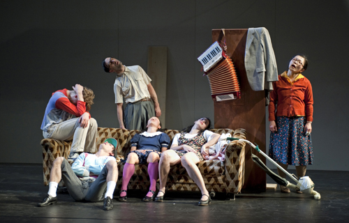 Das Sofa hat auf der Rückseite ein großes Loch mit roten Wundrändern. Ganz so, als habe jemand mit einer Schrotflinte hinein geschossen und eine Verwundung verursacht. Möbel scheinen in Sasha Waltz‘ Produktion „Allee der Kosmonauten“ ein eigenes Leben zu besitzen. Auch die Beine des Couchtischs, hinter dem sich die sechsköpfige Familie (Juan Kruz Diaz de Garaio Esnaola, Nicola Mascia, Zaratiana Randrianantenaina, Yael Schnell, Joel Suárez Gómez und Takako Suzuki) lümmelt, bestehen aus zwei Frauen- und zwei Männerbeinen. Der Staubsauger flippt aus und rast plötzlich durch die Lüfte. Das Personal zeigt sich hingegen apathisch oder seltsam ferngesteuert. Entweder schläft man mit offenem Mund vor der Glotze ein oder bewegt sich gleich Puppen, denen noch die letzte Geschmeidigkeit der Koordination fehlt. Es sind die Zwischentöne, die jenem Milieu abgehen, das hier im Biotop der Plattenbausiedlung vorgeführt wird.