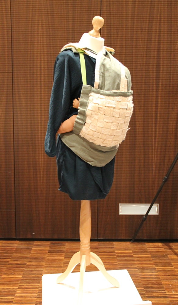 Die Tasche aus dem Online-Shop filltheblank.de schadet weder der Umwelt noch den Menschen, dadurch, dass in Deutschland produziert wird und nur ökologisch vertretbare und tierfreie Materialien bei der Herstellung verwendet werden. Die Babytrage in der Fotogalerie ist aus Rindenwolle hergestellt. Dieses Material wählte die Studentin Verena Aurbek, die sich für eine Kooperation zwischen ecosign, der Akademie für Gestaltung, und dem Rautenstrauch-Joest-Museum mit Materialverbindungen im Hinblick auf traditionelle Verwendung beschäftigte.