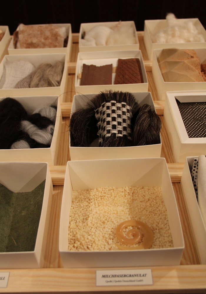 Katharina Jebsen (Master of Conceptional Textile Design) führte bei ihrem Vortrag über alternative Materialien in die Welt der Textildesigns ein: Neben traditionellen Materialien wie Wolle stellte sie auch unbekanntere, neuere vor: Milchfaser beispielsweise. Milchfaser wird aus Kasein, einem technischen Milcheiweiß gewonnen und bringt einige Vorteile, wie Nachhaltigkeit und antiallergische Eigenschaften, mit sich. Dieses Weiterdenken in textilen Zusammenhängen, das Vorantreiben von Materialentwicklungen und Überschreiten von Grenzen reize derzeit viele Textildesigner. Vielleicht haben es gerade die Designer in der Hand, die zukünftige Materialwelt zu bestimmen und ein Stück weit auch zu revolutionieren. Ein weiterer Redner, Ralpha Breyer, arbeitet bei „3FREUNDE", einem Online-Shop für Fair Trade Kleidung. In seinem Vortrag sprach er über die Möglichkeiten, Bedingungen und langfristigen Ziele einer nachhaltigen, ökologischen und fairen textilen Kette. Als Mitarbeiter von 3FREUNDE kennt er die vielgliedrige textile Kette, die für den Verbraucher oft sehr undurchsichtig erscheint.