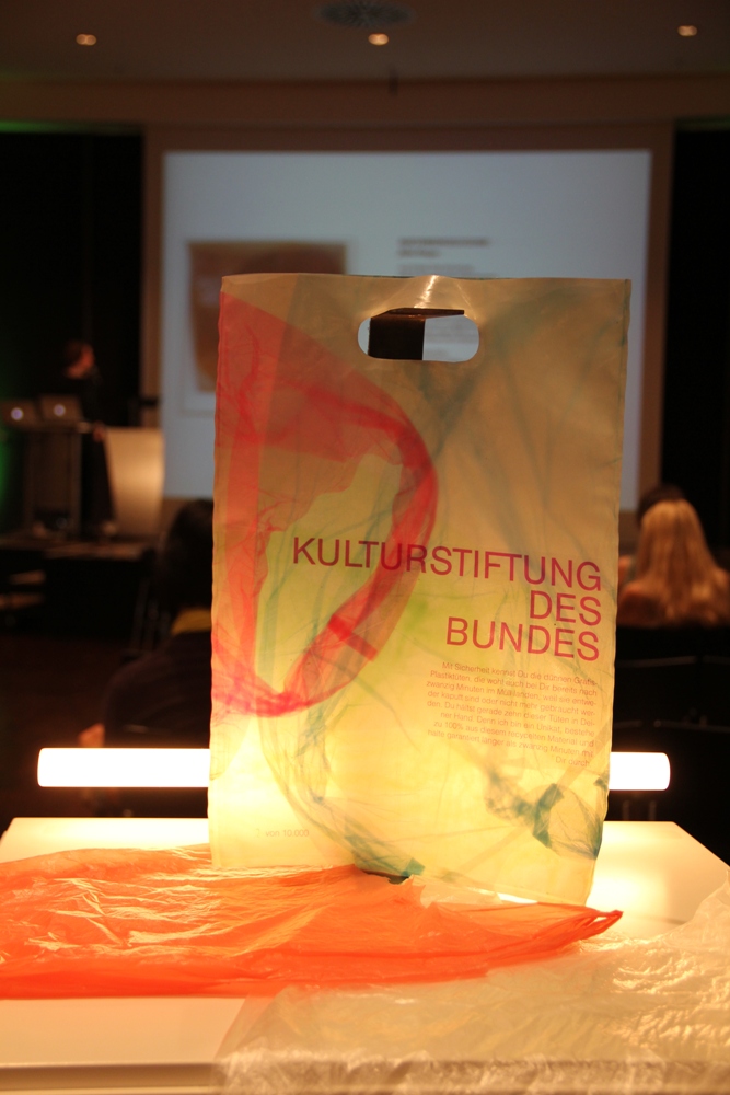 Der Gewinner des Studienprojekts „Cycle – clean bags“, das auf Initiative der Kulturstiftung des Bundes im Sommersemester 2014 an der Kunsthochschule Burg Giebichenstein stattfand, wurde auch ausgestellt. 20 Minuten oder noch kürzer ist die durchschnittliche Lebensdauer einer Plastiktüte aus Polyethylen. Das sind die herkömmlichen Gemüsetüten, die es in Supermärkten gibt. Die Innovation an der neuartigen Tüte: Der Entwurf von Stefanie Brendel ist enorm belastbar und hat im Vergleich zu konventionellen Plastiktüten eine wesentlich längere Lebensdauer, da sie aus ungefähr zehn ehemaligen Gemüsetüten gefertigt wird und unter Hitze und Druck stabil und langlebig gemacht wird. Dazu ist jede Tüte ein Unikat und sieht noch dazu unglaublich gut aus – zumindest für eine Plastiktüte…