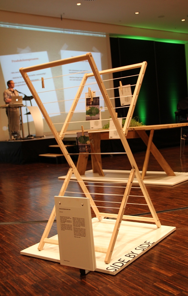 Der Wäscheständer stammt aus einer Werkstatt für behinderte Menschen: „Side by Side“ ist ein echtes Designprodukt, besteht nur aus natürlichen Materialien und hat einen praktischen Clou: Er ist enorm platzsparend, nämlich dadurch, dass er in die Höhe statt in die Breite geht.