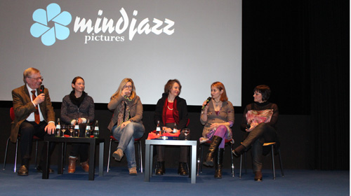 Moderiert wurde das Filmgespräch nach der Vorführung vom Vorsitzenden der „Deutsch-Isländischen Gesellschaft e.V.“ aus Köln, Dr. Sverrir Schopka. Dieser begrüßte auf dem Podium neben Heike Fink und Anna-Lena auch die Produzentin Juliane Thevissen, die Kamerafrau Birgit Gudjonsdottir und die Komponistin Julia Klomfass. Gemeinsam stellte sich die Expertengruppe den zahlreichen Fragen des interessierten Publikums. Heike Fink erzählte, dass sie 2008 in Island für einen Film über Elfen recherchiert habe und dabei zufällig einer ihrer künftigen Protagonistinnen begegnet sei. Als sie von deren ungewöhnlichem Lebensweg und den zahlreichen anderen deutschen Immigrantinnen erfuhr, entstand die Idee zu „Eisheimat“. Produzentin Thevissen hatte Fink bei der ifs in Köln kennengelernt und war sofort begeistert von ihrem Stoff. Nach ersten Zusagen seien die Finanzierungspartner NDR/arte aber sechs Wochen vor Drehbeginn überraschend wieder abgesprungen. „Ein Verschieben des Drehs war aufgrund des fortgeschrittenen Alters der Damen aber unmöglich, weswegen ich die Lücken in der Finanzierung mit eigenem Geld stopfte“, so Thevissen. Tatsächlich sind mittlerweile schon drei der Protagonisten verstorben, was dieser Entscheidung im Nachhinein Recht gibt.