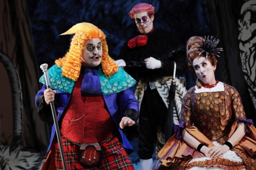 Die Akteure auf der Bühne sind sehr originell und farbenfroh gekleidet, die Damen tragen nicht nur bunte pompöse Krinolinen des französischen Hofes und haben mächtige Busen. Nein, sie bewegen sich auch im Hühnermarsch, scharren mit den Füßen, rupfen sich bei Kummer die Federn aus und bewegen den Hals nach Hühnermanier; auch die formulierten Übertitel machen den Spaß mit („Streithenne“ „Eingebildete Pute“). Die Herren bzw. die Hähne stehe dem in nichts nach: Hahnenkamm und Kehllappen, dominante Schwanzfedern und ein gockelhaftes Gehabe. Die zahlreichen Koloraturen und die begleitende Musik lässt schon an „Krach im Hühnerstall“ denken – vielleicht war das auch Intention von Cimarosa, menschliches Verhalten durch Tiere zu karikierten.