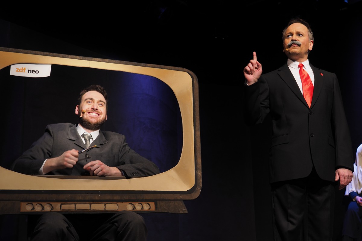 Trumps Wahlsieg und den Beginn seiner Amtszeit konnte der alternative Karnevalsverein noch nicht zufriedenstellend auswerten – vielleicht zum Glück, denn viele Versuche, ihn zu imitieren, gehen (auch bei Fatal Banal) schief. Das sagen zumindest seine Tweets. Umso wichtiger sind das mit „Melania“ und „Ivanka“ (in weißen Fleecejacken) zum Besten gegebene Trump-Lied „(Ich führe jetzt ein) Geiles Leben“ und Trumps Anruf auf dem Handy von Christoph Stubbe mitten in einer Moderation. „Yes, I’m the president of Fatal Banal. Yes, in Ehrenfeld – Field of Honor.“ Trump will angeblich wissen, wie es ist, Präsident zu sein. – Bei Erdogan ist man weiter. Der türkische Präsident (Ernst) wird mit einer kurzen Chronologie des Aufstiegs und der Skandale „gewürdigt“ – in gereimten Dialogen: „Gewählt ham dich 50 Prozent / der Rest dich dann wohl besser kennt“, lautet ein Einwurf von Cem Özdemir (Schubert), den Erdogan aber nicht als echten Türken ansieht. „Freiheit ist ein hohes Gut / das sage ich euch als Regent / Wenn Presse kritisieren tut / gehört sie aber eingeschränkt“. Jan Böhmermann (Tim Müller) tut in dieser Version der Ereignisse mit der türkischen Flagge ordentlich eins auf den Popo kriegen. Kim Jong-un (mit Rakete) und Merkel (mit Merkelraute) müssen sich hier mit Nebenrollen abfinden.