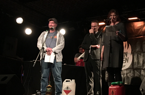 Es gab dann aber auch wieder etwas zum Lachen: Klaus Rother wirkte zwar ein wenig verloren, als er zaghaft ins Zentrum der Bühne trat, jedoch überraschte der Kölner dann mit herzerwärmenden, ehrlichen Gedichten über „Würstschen“ und sich übergebende Fräuleins – ganz ohne Prunk und Schnörkel. Und alle Gedichte in waschechtem Kölsch vorgetragen. Kurz konnten die Zuschauer die Lachtränen trocknen und schon stand Ahne aus Berlin auf der Bühne. Was anfangs wie die Beschreibung eines LSD-Trips wirkte, war der Verlauf eines Tages, gesehen durch die regenbogenfarbene Brille eines – leicht besessenen – Verliebten. Sächsischer Dialekt gepaart mit ausnahmslosen Übertreibungen über Gefühlsblindheit und Wolke sieben, eine interessante Mischung.