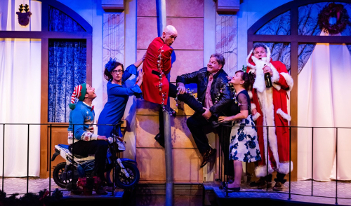 Es begann schon chaotisch: Von den vorgesehenen zwölf Schauspielern waren nur drei da, zwei weitere und eine sechste trödeln hinterher, alle schimpften auf die Kölner Staus und die chronisch verspätete Deutsche Bahn. Auch zwei Frauen für die Garderobe und Maske wurden im Publikum gesucht und hinter die Bühne gebeten. Ein origineller Beginn: Man erfuhr, dass die vorgesehene Rollenverteilung den Schauspielern eh nicht gefiel und einigte sich gezwungenermaßen auf eine Doppelbesetzung; nun konnte es endlich losgehen mit der Geschichte in Paris an Heiligabend in zwei Familien. Aber beileibe nicht in den Wohnungen, sondern auf zwei nebeneinander liegenden Balkonen im Mehrfamilienhaus. Markus Ganser hat im witzigen Stück des Franzosen Gilles Dyrek sowohl Regie geführt wie auch eine originelle und praktische Bühne gebaut: Man sieht sich gegenseitig und kann sogar herüberklettern – wenn auch mit abenteuerlicher Mühe unter gefährlichem Verlust der Regenrinne. Was man aber nicht sieht, ist die eigentliche Geschichte drinnen vor dem Weihnachtsbaum und in der Küche. Das ist auch gar nicht erforderlich, denn alle Personen stürzen regelmäßig heftig diskutierend an die frische Luft.
