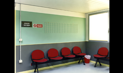 „Zu viel Sonne für Antonioni“ heißt eine Fotoserie von Alessandra Dragoni (*1963) direkt am Eingang, die mitunter den zeitlichen Abstand zum Italien Antonionis vor Augen führt, in dem analog fotografiert wurde und viele Arbeitsplätze in der Industrie entstanden. Sie vermittelt mit Bildern und abgelichteten Zeitungsartikeln aus Archiven etwas vom Ravenna zur Zeit des Drehs, wo das Wetter weniger nebelig war, als Antonioni es sich für seine Zwecke wünschte. Folglich musste gewartet werden, so wie Dragoni es als professionelle Fotografin auch kennt. William Guerreris (*1952) C-Print „Public spaces“ (1991-1993) zeigt menschenleere Warteräume und Flure in öffentlichen Gebäuden der Film-Region Emilia Romagna, die mit bewussten farblichen Entscheidungen und ihrer klar definierten Einrichtung fast wie drehfertige Antonioni-Kulissen wirken. Ähnlich entschied sich João Grama (*1975). Der aus Portugal stammende Leipziger Meisterschüler fotografierte die farbigen Wände von heute geschlossenen Nervenheilanstalten in der Region, um mit seiner Arbeit, in Anlehnung an Giulianas Anpassungsschwierigkeiten im Film, an diese Art des Einsperrens zu erinnern („We only painted one side of the Forest“, 2015).