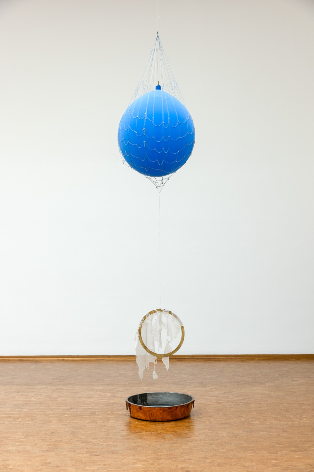 Füsun Onur, Let‘s Meet at the Orient, 1995, Ausstellungsansicht Museum Ludwig, Köln 2023, © Füsun Onur, Foto: Rheinisches Bildarchiv Köln/Vincent QuackDas gilt gleich für die erste Installation, auf die man über die Treppe zu schreitet, den „Kontrapunkt mit Blumen“. Man betritt ein Zelt, das einen in seinem sanften Blau gänzlich umfängt. Künstlichkeit und Natur treffen aufeinander, man denkt an eine weite Landschaft unter blauem Himmel oder an einen Schwebezustand wie im Wasser, und doch scheint alles riskant, gefährdet. Das Zelt erinnert an den Ort der Nomaden oder an den Bosporus als Fluss, an dem Füsun Onur in Istanbul lebtund der Europa von Asien trennt. Die (willkürliche) Setzung von Zentrum und Peripherie und der Umgang mit Orient und Okzident ziehen sich leitmotivisch und assoziativ durch ihr Werk, zusammen mit dem Bewusstwerden von Prägungen und Einflüssen. Erinnerung ist nicht nur Vergangenheit, sondern mehr noch Gegenwart. Im Bild „Traum“ (1981) schaut man durch gespannte farbige Seile auf die Wand, kleine Kugeln sind eingeflochten. Hier erinnert alles an einen strömenden Fluss, der die Spuren der Zivilisation mit sich trägt. Immer wieder verwendet Füsun Onur Möbel aus ihrem Haus und vermittelt so die Sicht des Kindes. Das gilt auch für ihre Bodeninstallation im Museum Ludwig, bei der sie langeStricknadeln in verschiedenen Konstellationenangeordnet hat, noch in Beziehung zu goldenen Knäueln und ausgelegten Schnüren sowie einzelnen Porzellanfigürchen.