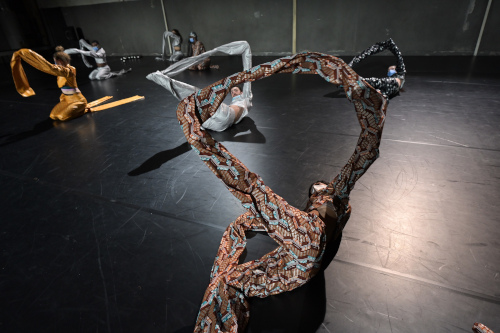 Eigene Interpretationen von Afro-Dance weisen Überschneidungen auf mit dem ruckartig gesprungenen Todestanz. Geschichtslektionen werden begleitet vom verspielten Tanz mit großen, bemalten Papierbögen. Zwischen Sprachengemisch und zu leisem Ton fällt es zunehmend schwer, den Vorträgen inhaltlich noch zu folgen, zumal Bild und Geräusche und Tanz natürlich auch ablenken. Aber vielleicht reicht es, die entscheidenden Sprachfetzen aufzunehmen.