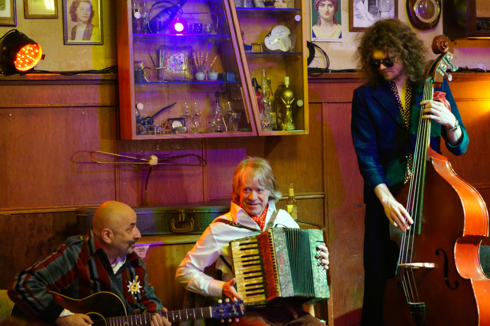 Karneval 2026 spielt er wieder traditionell in der Kölner Philharmonie auf und eröffnet damit seine neue Tour „Ellebogen vom Tich!“. Wie kommt man denn bitte auf so einen Titel? „Man muss sich, sag ich mal, reduzieren in seinen Gedanken. Man muss praktisch plötzlich doof sein,“ erklärt Helge Schneider gut aufgelegt den Journalist:innen, die er in die Kölner Wohnzimmerkneipe Weißer Holunder geladen hat. Eine Location, die nicht besser hätte ausgesucht werden können: Gerahmt von purem Nostalgie-Inventar aus den 1950er Jahren, versammelt sich Helge Schneider mit Leo Richartz (Kontrabass) und Sandro Giampietro (Gitarre) auf der kleinen, atmosphärisch ausgeleuchteten Bühne. Schneider ist zum ersten Mal hier, „Weißer Holunder“ kannte er bisher „nur von auf’m Pfannkuchen“.