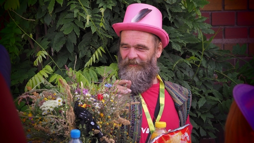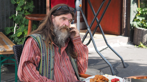 Rolf Tepel: Mit 24 habe ich den Entschluss gefasst, auf Wanderschaft zu gehen. Dabei war ich drei Jahre zu Fuß unterwegs und die anderen zehn Jahre mit Zirkuswagen, Zelten, in den verschiedensten Berufen und Berufungen unterwegs. Ich spiele 20 Instrumente und habe mit einer künstlerischen Zielrichtung in allen Handwerksberufen gearbeitet. Zum Abschluss, nach dem Mauerfall und dem ersten Irakkrieg hatten wir unsere Wagen neben dem Flughafen Hahn im Hunsrück. Mit Ende des Kalten Krieges wurden die ganzen Waffen aus den Bunkern geholt, in die Flugzeuge gesteckt und über Kuwait abgeworfen. Danach kam kein Flieger mehr zurück, und das hat mich höchst elektrisiert, mich mit der Frage „Deutschland und Frieden“ auseinanderzusetzen. Deshalb habe ich beschlossen, einen Stein durch Deutschland zu rollen, von hier nach Berlin, 1993 bis 1994, und bin nach dieser Aktion, die für mich persönlich von höchstem Wert war, die aber in der Aufmerksamkeit der Öffentlichkeit völlig untendurch gegangen ist, nach Köln zurückgekehrt und habe jetzt hier schon wieder 21 Jahre auf dem Buckel und davon zehn hier auf dem Eifelwall.