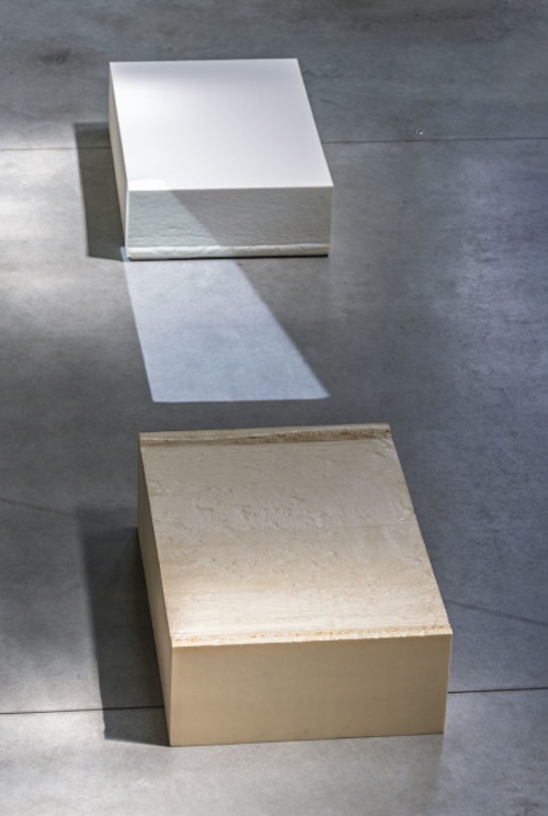 Johanna von Monkiewitsch erforscht die unterschiedlichen Dimensionen von Licht und macht es sichtbar. Dazu passt, dass sie 1979 im Süden, in Rom geboren wurde und sich 2016 mit einem Stipendium in Venedig aufgehalten hat, von wo sie das Tageslicht, das sie an einer Wand im Palazzo Ducale gefilmt hat, als Video mit nach Hause nach Köln gebracht hat. Im Studium an der Kunstakademie Braunschweig hat sie noch davor die Bewegung des Tageslichts, das von oben in das Atelier gefallen ist, mit weißen Kreidestrichen auf dem Boden fixiert. Festgehalten als Fotografie mit dem Titel „26.06.2005 / 12:45-13:20“, komplettierten sich die Linien zur Sinnestäuschung von in sich stufig verschobenen Kuben: von minimalistischem Körper und Masse. 2018 hat sie in eine 240 cm hohe MDF-Platte mit einer abschließenden rechtwinkligen Leiste deren horizontalen Schatten, der sich infolge der Beleuchtung direkt darunter bildete, mit Pigmentfarbe als Trompe l’oeil über- und nachgemalt. Diese Skulptur ist derzeit im Kunstmuseum Bonn in der Ausstellung „From Dawn Till Dusk“ zu sehen. Dort begegnen sich also die Simulation eines realen Schattens und der reale Schatten dahinter, der im Lehnen auf die Wand geworfen ist.