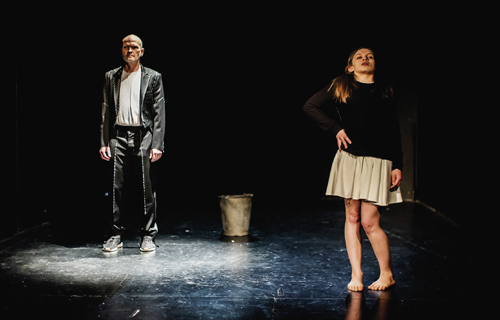 Sie kommt ganz schlicht daher, diese Inszenierung: der leere Bühnenraum, ein Blecheimer in der Ecke, zwei Schauspieler. Hauptfigur Isa wird zu Beginn nicht nur von Alrun Hofert gesprochen. Auch Michael Witte (alle anderen Rollen) spricht Teile von Isas Text mit. Das steht nicht in der Vorlage (Bühnenfasung: Robert Koall), stellt aber die autobiografischen Anteile der Geschichte stärker in den Mittelpunkt. Isa kennt man zwar als durchgeknallt-geheimnisvolle Nebenfigur bereits aus „Tschick“. Doch Wolfgang Herrndorfs unvollendet hinterlassener Roman „Bilder einer großen Liebe“ ist kein „Tschick 2“. Der Roman erzählt aus autobiografischer Perspektive die Geschichte der 14-jährigen Asa, die aus der psychiatrischen Anstalt flieht. („Wenn ich will, dass das Eisentor aufgeht, dann geht das Eisentor auf. Und raus.“) Sie trifft in einem düster-märchenhaften Stationendrama auf gescheiterte Bankräuber, schräge Schriftsteller und tote Förster.