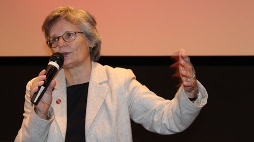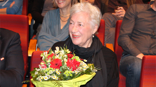Traditionell begann auch das 16. Filmplus mit einem ersten Screening aus der Reihe Hommage. Ausgewählt wurde einer der Lieblingsfilme von Ursula Höf, der 1999 unter der Regie von Rolf Schübel entstandene „Gloomy Sunday – Ein Lied von Liebe und Tod“. Bei dem Film hatte Höf nicht nur für den Schnitt verantwortlich gezeichnet, sondern gemeinsam mit Dirk Jacob auch das Sounddesign erstellt. Noch vor der Projektion des Filmes, die Mithilfe des Filmmuseums Düsseldorf mit einer nie zuvor gespielten 35mm-Archivkopie des Films erfolgte, würdigten Werner Busch und Laudatorin Helke Sander das beispielhafte Schaffen Höfs, die nicht nur über 70 Montagearbeiten vorweisen kann, sondern sich auch jahrelang für das Berufsbild der Editoren engagierte und als Gewerkschaftsvertreterin tätig war. Regisseurin Sander datierte die erste Begegnung mit „Olla“ Höf auf das Jahr 1971 zurück, als beide im gleichen Haus gelebt hätten und sich nur zufällig im Treppenhaus begegnet seien. Ihr frauenpolitisches Engagement, obwohl in eher gegensätzlichen Organisationen, habe ein erstes verbindendes Element zwischen beiden geschaffen. 1977 begann schließlich die berufliche Zusammenarbeit und die bis heute andauernde persönliche Freundschaft der beiden Frauen. Höf unterstrich in ihrer Danksagung, dass sie zusammen mit Helke Sander einen gemeinsamen Humor entwickelt habe, der schließlich die Grundlage für ihre Zusammenarbeit lieferte. Zu großem Applaus merkte die Ehrenpreisträgerin weiter an: „Ich bin sehr froh, dass mit dieser Auszeichnung auch mal meine 38 Jahre berufspolitischer und gewerkschaftlicher Arbeit gewürdigt werden.“