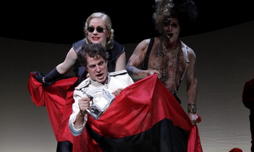 Ausstatter Darko Petrovic hat durch Tieferlegung der Spielfläche einen Orchestergraben geschaffen, die 14 Musiker sitzen rechts und links eines Mittelsteges, der Dirigent steht an der Seite. Die Leistung der Mitglieder des Gürzenich-Orchesters unter ihrem großartigen Leiter Rainer Mühlbach wird den hohen Ansprüchen der Partitur in jeder Sekunde gerecht. Da leuchten Anklänge an Mahler auf, da gibt es musikalische Zitate aus den Songs von Kurt Weill, da gehen Foxtrott-Rhythmen des Shimmytanzes unter die Haut und zum Schluss erklingt sogar erhaben ein Luther-Choral. Die unglaublich reichhaltige Farbpalette der Partitur wird von Mühlbach und seinen Musikern jedenfalls herrlich ausgeleuchtet.
