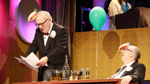 Ob die fünfte Jahreszeit tatsächlich lustig wird, hängt ganz davon ab, wer sich wann wohin begibt: Garantiert etwas zu lachen gibt es bei der Bonner Karnevalsrevue Pink Punk Pantheon (am 1./3.-7./9.-11./14.-17.2.), die ihre 32. Session feiert. Natürlich unter dem bewährten Vorsitz von Rainer Pause als Fritz Litzmann und Norbert Alich als Hermann Schwaderlappen, ihres Zeichens Begründer des Heimatvereins Rhenania n.V., der seit 1983 existiert und den Mitgliedern die Gelegenheit gibt, den einen und anderen Klaren zu kippen, um die schrecklichen Zustände in der Welt aushalten zu können.