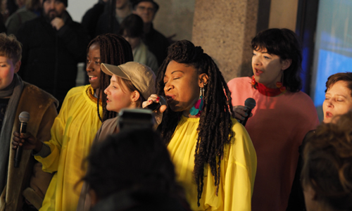 Die Darbietung, die auch als eine Intervention bezeichnet wurde, litt darunter, dass die Lautsprecher für die anderen Programmpunkte in eine andere Richtung wiesen und weiter hinten wenig zu verstehen oder zu erkennen war. Sie wirkte zudem von Seiten des Künstlers, der viele Handgriffe auszuführen und einiges zu sagen hatte, nicht sehr souverän durchgeführt. Er veranstaltete wohl bewusst keine „Show“, die Aufmerksamkeit an sich zieht, sondern demonstrierte lediglich Konzepte. Doch das junge Publikum hatte zu einem überwiegenden Teil nicht die nötige Geduld mitgebracht. Den ganzen Abend über konkurrierte das Soziale mit dem Künstlerischen, dem eine Moderation geholfen hätte. Ein Besucher, der aus Schweden angereist war, äußerte sich enttäuscht von dem in diesem Fall fehlenden Wechselspiel zwischen Performer und Publikum. Die engagierten Musikerinnen Melissa Logan, Leila Akinyi (eine talentierte Rapperin aus Köln) und LaToya Manly-Spain konnten zur Vermittlung einiger grundsätzlicher Ideen zu Kultur und öffentlichem Raum mit Beats vom Laptop immerhin noch die Feierlaune des Freitagabends für sich anzapfen.