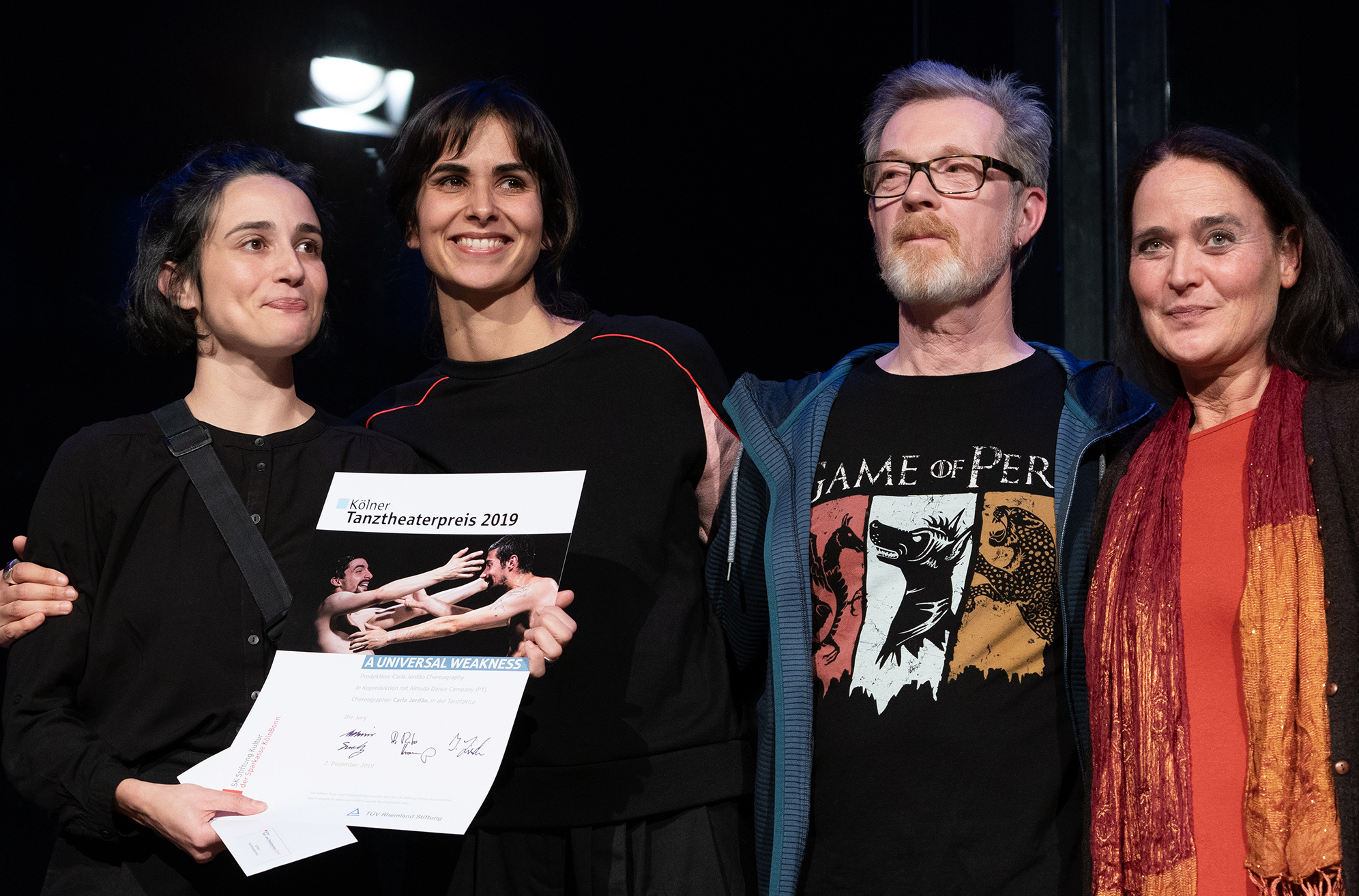 Mit dem Tanztheaterpreis wurde „A Universal Weakness“ von Choreografin Carla Jordão (37) ausgezeichnet. Die Kölner Koproduktion mit der Almada Dance Company in Portugal, die den Optimierungswahn und das Streben nach Einzigartigkeit aufs Korn nimmt, war im Juli in der TanzFaktur gezeigt worden. Ein Jurymitglied lobte den „absurden Umgang mit einem intellektuellen Thema“ und den Minimalismus: Die Cheoreografin habe sich „allein auf ihr Handwerk verlassen“. Das Stück wird am 20.12. bei Barnes Crossing zu sehen sein.
