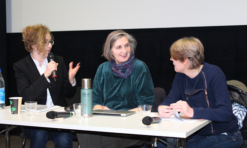 Das Gespräch über feministische Filmarbeit in Kollektiven mit Madeleine Bernstorff wurde von den Filmprofessorinnen Erica von Moeller und Sophie Maintigneux moderiert, die sich ihrerseits bereits seit Jahren für Chancen und Sichtbarkeit von Frauen in der Filmbranche stark machen. Mit Bernstorff sprachen die beiden zunächst über deren Werdegang und ihre feministische Sozialisation. Die Gastrednerin aus Berlin erläuterte, dass sie zunächst im Alter von 14, 15 Jahren als „höhere Tochter“ mit den Werken von Simone de Beauvoir in Berührung gekommen sei. Eine 68erin sei sie nicht mehr gewesen, weil sie dafür zu jung gewesen sei, für die Punkbewegung schließlich aber sei sie schon zu alt gewesen, also irgendwo dazwischen anzusiedeln. Nach ersten Arbeiten im Münchner Frauenzentrum und extrem politischen Filmveranstaltungen im Werkstattkino München habe Bernstorff schließlich mit einem Kollektiv in Berlin ein ehemals türkisches Kino übernommen. „Dort spielten wir feministische Programme, auch zur ersten Lesbenwoche, die dort 1985 unter dem Titel ‚Ladies Only‘ stattfand“, erzählte sie im Gespräch in der Aula der KHM. Die Veranstaltungen seien damals durchaus kontrovers aufgenommen worden, insbesondere die Projektion des lesbischen Vampirfilms „Blut an den Lippen“ hätte zu Auseinandersetzungen zwischen „SM- und Vanilla-Lesben geführt, letztere bezeichneten wir ironisch auch als Landlesben“. Kurz darauf war Bernstorff auch an einer Handzettel-Aktion während der Berlinale beteiligt, bei der unter dem Slogan „Haben Sie heute schon einen Film von einer Frau gesehen?“ bearbeitete Berlinaleprogramme an die ZuschauerInnen verteilt wurden, auf denen mit Tipp-Ex alle Filme von männlichen Regisseuren entfernt worden waren und nur „kleine Oasen von Filmen von Frauen“ erhalten blieben.