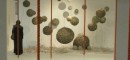 24 Lote aus Drahtgeflecht an roten Hanfseilen sind das zentrale Dreh- und Anstoßelement im weißen Raum. Wenn man sie leicht anstößt, gerät der Kreis, in dem sie aufgehängt sind, aus der Geometrie, dann bringen die Objekte die Verhältnisse ins Wanken (Liz Mields-Kratochwill, 2008).
