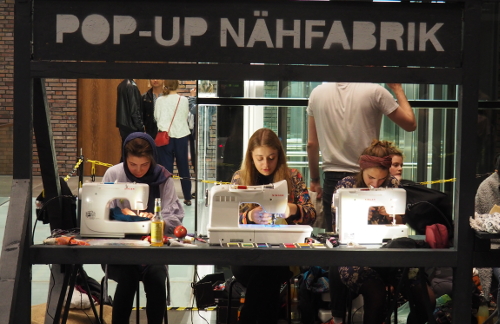 In ganz unterschiedlicher Weise haben sich die Studierenden dem Thema angenähert – drei Arbeiten haben dabei besonders überzeugt. Zum einen bringt die mobile „Pop-up Nähfabrik“ von Sarah Klein und Nico Schmitz den Produktionsprozess in den öffentlichen Raum. „Es geht um Wertschätzung“, so das Duo, das mit seiner Installation dazu einlädt, ausrangierte Kleidungsstücke wieder herzurichten, „aber auch darum, die Augen für die Situation zu öffnen: Mode wird immer von Menschen gemacht.“ Und das meistens in Billiglohn-Ländern unter katastrophalen Bedingungen. Anstatt eines sicheren Einkommens bedeutet die Textilbranche für (in der Regel) Arbeiterinnen Ausbeutung und Unterdrückung.