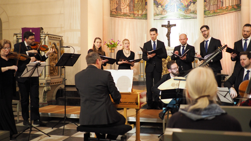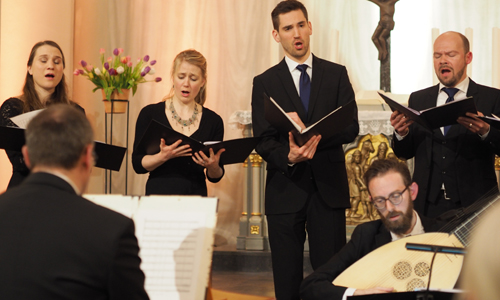 Man darf sagen, dass die Frauen an diesem Abend einen besonders starken Eindruck hinterließen, neben Violistin Regula Keller die beiden Sopranistinnen Lia Andres und Christina Boner-Sutter, die für „Chiome d’oro“ und „Ohimè, dovè il mi oben“ auch als Duo auftraten. Die männlichen Instrumentalisten wirkten konzentriert und routiniert, wobei Regula Keller und Cosimo Stawiarski an den Violinen bei Sonaten von Monteverdis Zeitgenossen Francesco Turini besonders glänzen konnten. Bei den Sängern gab es auch sehr schöne Stimmen, die Stücke wurden gut beherrscht und meistens dramatisch, wo nicht gar (wie vom Komponisten vorgeschrieben) darstellend vorgetragen. Beim Madrigal „Gira il nemico“, in Tradition der Commedia dell’arte geschrieben, schienen die in schwarzen Anzügen angetretenen Sänger zu den Comedian Harmonists zu werden, man hätte nur noch die Instrumente weglassen müssen. Die Akustik der Kirche erzeugte, wo von den Sängern und Sängerinnen gewollt, eine Allgegenwart der stärkeren Stimmen, erschwerte aber auch etwas das Verständnis, ließ wenig vom Cembalo übrig und brachte für die schnelleren Stücke zu viel Hall mit sich. Man fragt sich, ob nicht-sakrale Musik aus der Zeit nicht besser in anderen Räumlichkeiten zur Wirkung kommt, ist doch die Assoziation von Kirche und Barock in den Köpfen schon stark genug. – Als Zugabe erklatschte sich das zufriedene Publikum ein schönes „Lidia, spina del mio cure“ aus den „Scherzi musicali“.