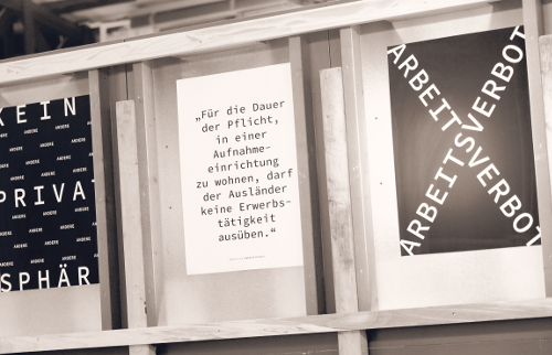 „Überhaupt ein Dach über dem Kopf zu haben – das ist natürlich das Wichtigste“, erklärt mir Architekt Heribert Weegen. Aber die vier Quadratmeter, die in den öffentlichen Verordnungen pro Person in den Flüchtlingsunterkünften vorgeschrieben seien, ließen neben den Möbeln keinen Raum zur freien Bewegung. Aufgebaut im Atelierzentrum Ehrenfeld sind zwei Container in genau dieser Größe. In dem einen stehen ein Bett, ein metallener Kleiderschrank, ein einfacher Tisch mit Stuhl und ein Mülleimer – eine Einrichtung, mit der wohl jeder Asylsuchende zu tun hatte. Eine Personalisierung der Räume in Flüchtlingsunterkünften mit anderen Gegenständen ist nicht erlaubt. Diese und viele andere Zitate aus Verordnungen und Berichten sind auf der Rückseite der Außenwände der wirklich nicht großen Wohneinheiten zu lesen.