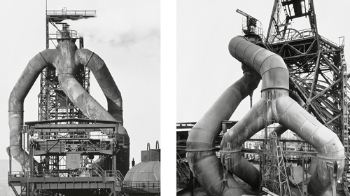 Die Bechers würdigen die wenig beachteten Zweckbauten anonymer Architekten, die aber doch Wahrzeichen der Schwerindustrie sind. Sie beschreiben, wie hier die Form der Funktion folgt und vergegenwärtigen die Monumentalität in einer Landschaft, die meist aus Brachen besteht. Auch fokussieren die Bechers die Röhrenkonstruktionen, nehmen sogar Ausschnitte der organischen Gebilde und wecken augenblicklich die Vorstellung von riesenhaften Wesen. So schlängeln sich die Rohre um abstrakt konstruktive Elemente. Die Bechers wenden hier noch weitere Verfahren der Ansicht an. Da sind die Überblicke über das gesamte Areal, das wie eine Festung wirkt. Eine Fotografie führt den Blick über die gestaffelten Hausdächer der Ortschaft, ehe er auf die Industrieanlage trifft. In einem solchen Bild erkennt man sogar Menschen, die als Maß für die Größe der Hochöfen dienen. Mitunter schwingt etwas Romantisches mit. Dann wieder vermitteln die Bechers die raue Nüchternheit der Industrie. Wie sehr sich die Bechers in ihre Motive vertieft haben, bei Wind und Wetter tagelang auf das richtige Licht gewartet und dann doch nach einem besseren Standort gesucht haben, erschließt sich auch daraus, dass sie mitunter nach Jahren wieder am gleichen Ort fotografiert haben.