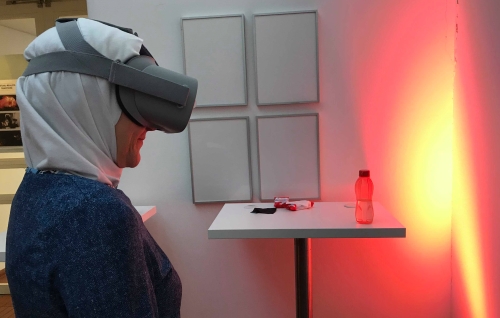 Mejdah, gebürtige Tunesierin, ist das erste Mal beim Festival. Vorsichtig setzt sie die VR-Brille über ihr Kopftuch. Auch das ist ihr erstes Mal. „Tanz und Musik bewegen mich immer sehr stark, sodass ich bei Tanzstunden manchmal kurz stehen bleiben muss, um durchzuatmen, um nicht von meinen Gefühlen umgerissen zu werden“. Heute jedoch steht sie mit der VR-Brille auf dem Kopf fest auf beiden Beinen. Die meisten der anderen Besucher setzen sich für diese neue Erfahrung lieber hin. Mejdah jedoch geht voll auf in der neuen Welt und weicht ruckartig unsichtbaren Personen aus, lacht laut auf vor Begeisterung und fegt ein paar Flyer vom Tisch. Was sie sieht: Ein Paar, zum Greifen nah, das tanzt, liebt und lebt in verschiedenen Jahrzehnten. Ganz schön nah wird es in „Through You“ von der bezaubernden Lily Baldwin, multipler Künstlerin aus New York.
