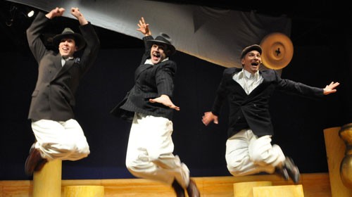 Fortan übernehmen die Bauklötze den Part des „7. Hauptdarstellers“, der auch schon mal spontanen Zwischenapplaus einheimst. Schnell schwappt die gute Laune von der Bühne auf die Zuschauer über, und die kleine Komödie um drei mittellose Freunde, die sich mit einer Tankstelle über Wasser zu halten versuchen und in dasselbe Mädchen verlieben, nimmt ihren Lauf. Da Lilian aus reichem Hause stammt, lässt sich das Happy End erahnen. Bis dahin ist der Weg das Ziel. Und den beschreiten Martin Kiuntke (Willy), Werner Bauer (Hans) und Alexander Soehnle (Kurt) mit so viel Spiel- und Sangesfreude, dass man am liebsten in ihren Freundeskreis treten möchte. Die witzigen Dialoge fliegen einem nur so um die Ohren, wie zu besten „Screwball Comedy“-Zeiten, und auch die Anforderungen, die Marga Renders präzise Choreographie an die Schauspieler stellt, meistern alle mit Bravour. Karoline Goebel als Objekt der dreifachen Begierde strahlt jene 30er Jahre-Filmdiva-Aura aus, die auch heute noch betört. Dazu hat sie jene so oft besungenen Beine „der Dolores“, die, wenn sie mit Alexander Soehnle zu einer Fred Astaire/Ginger Rogers-Tanz- und Stepp-Paraphrase abhebt, den Zuschauer im siebten Musical-Himmel mitschweben lässt. Aber auch Juliane Dreyer ist eine aufregende Femme Fatale, die Lilians Vater „Mops“ genau wie seine Tochter um den Finger wickelt: Christian Theodoridis ist in dieser Rolle in seiner tapsigen Behändigkeit überaus komisch. Selbst den beiden von Christian Kerkhoff (Dr. Kalmus) und Katrin Höft (als seine Sekretärin) gespielten Nebenfiguren lässt Wiggers kluge Regie Raum, um sich zu profilieren. Der musikalische Leiter Stephan Ohm hat mit seiner fünfköpfigen – geschickt im Bühnenbild versteckten – Band Heymanns Melodien von jeder altersbedingten Patina befreit und lässt sie in jenem fröhlich-jazzigen Sound erklingen, der einen beschwingt nach Hause gehen lässt.