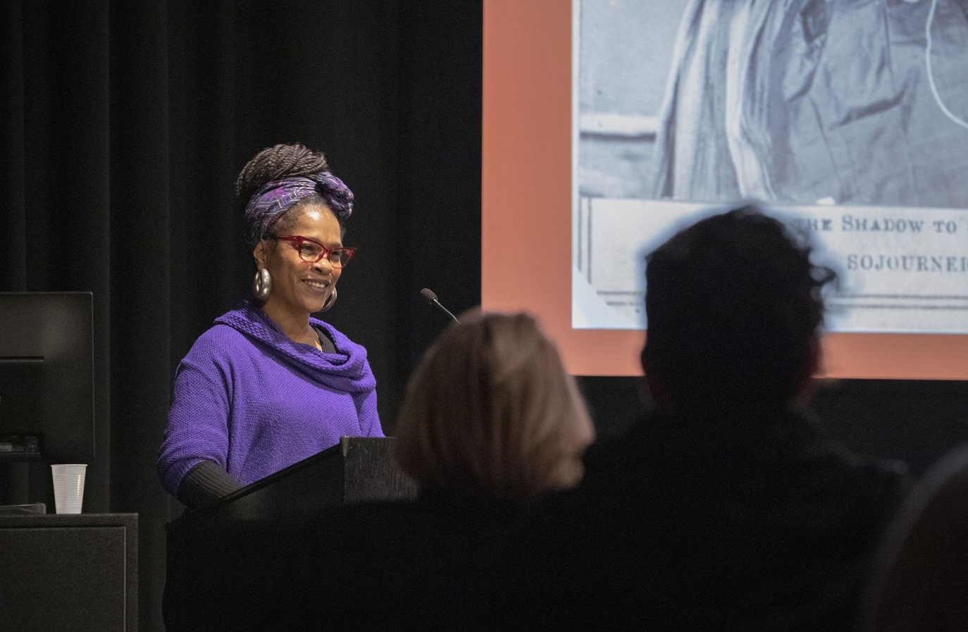 Kelly stellt in der KHM das Leben Sojourner Truths vor und liest ihre Rede – eine gelungene Einleitung für die Vorführung von „Sojourner“, einem 22-minütigen Film von Cauleen Smith aus dem Jahr 2018. Ausgesucht hat ihn die Moderatorin des Abends, Dr. Maxa Zoller, unter anderem neue Leiterin des Internationalen Frauenfilmfestivals Dortmund / Köln (24 - 29.3.). Smith reimaginiert in ihrem Film eine radikale feministische Utopie und schafft eine Hommage an Sojourner Truth. Der Film verbildlicht die spirituelle Reise, auf die sich die Frauen begeben, bekleidet mit afrofuturistischen Outfits, deren Leuchtkraft eine ungeheure Energie erzeugt. Untermalt werden die ausdrucksstarken Bilder von Zitaten aus der der afro-amerikanischen Freiheitsbewegung.