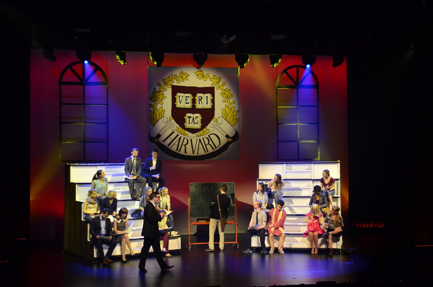 Hat man erst einmal denpseudo-feministischen Touchder nurin einigen Details hintersinnigen Komödie mit ihren Seitenhieben auf die überkandidelte Beverly-Hills-Gesellschaft und die ebenso versnobte Elite-Uni-Community geschluckt, dann kann man sich mit Vergnügen auf das von Laurence O‘Keefe (Musik), Neil Benjamin (Gesangstexte) und Heather Hach (Buch) geschriebene Musical einlassen. Denn hier gilt, wie bei vielen „leichtgewichtigen“ Beispielen des Genres: Nicht das Was, sondern das Wie ist entscheidend. So bestaunt man das innovative Bühnenbild von Christian Simon, das die ersten Szenen hinter den scherenschnittartigen Umrissen von Ellas Schoßhündchen Brutus spielen lässt und ihren „griechischen Begleitchor“ mit modernster Hebebühnentechnik vom Himmel kommen lässt.