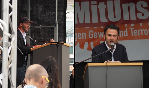 Fatih Cevikkollu, der auch das Bündnis „Arsch huh“ vertrat, fand es in seinem Redebeitrag „eigentlich absurd“, dass man sich von Terroristen distanzieren müsse. Es sei aber wichtig, „ein Zeichen zu setzen“, für Leute, die nicht zu Unterscheidungen fähig seien. „Terroristen sind die, die ihren Arsch in Menschenmengen in die Luft jagen, die mit Lkws und Autos in Menschenmengen fahren und sie mit Messern angreifen, die nicht mal vor Kindern bei Konzerten halt machen. Es ist nicht mehr zu ertragen, und wir sind kurz davor, die Nachrichten über solche Mordanschläge als normal zu empfinden, wie Staumeldungen oder den Wetterbericht. Wir haben zu lange geschwiegen.“ Das Tagesmotto „Nicht mit uns“ machte er sich zu eigen.
