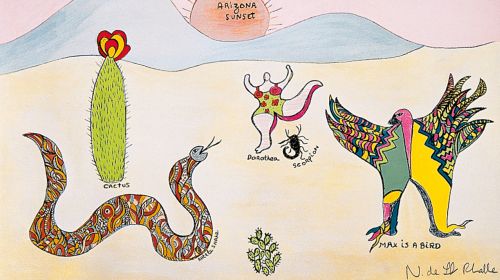 Niki de Saint Phalle ist erst relativ spät zur Kunst gelangt, Anfang der 1950er Jahre. Nach einem Nervenzusammenbruch ist die künstlerische Betätigung für sie zunächst Therapie; etwas Autodidaktisches und Spontanes, dabei Expressives wird ihre Kunst zeitlebens kennzeichnen. Traumbilder drängen nach draußen, immer stehen Menschen und Handlungen im Zentrum ihrer Darstellungen. Neben Malereien entstehen frühzeitig Collagen, oft in einer überbordenden Detailfreudigkeit, bei der sich Farbfäden und Kleckse verselbständigen und das Bildformat vereinnahmen. Mit ihren Assemblagen, bei denen sie alltägliche Gegenstände, aber auch Waffen auf der Fläche montiert, tritt sie dann um 1960 endgültig in die Gegenwartskunst ein; sie wird Mitglied der wichtigen Pariser Avantgarde-Gruppe Les Nouveaux Réalistes. Aber sie entfernt sich auch augenblicklich wieder vom Realismus, mit ihren Schießbildern, bei denen sie oder andere auf Farbbeutel über den Darstellungen schießen, so dass sich die Farbe teils gesteuert, teils zufällig über die Assemblage ergießt – Kunst wird hier zum kollektiven Happening, trägt aber auch zur Verarbeitung persönlicher Erlebnisse bei; zugleich schwingt politischer Protest (an den Kriegen im Kongo und in Algerien) als Anliegen mit.
