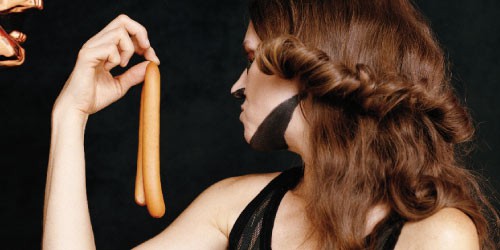 Dann dringt man in schmale Tunnel ein, wo die Diaprojektionen „Viola“ und „Viola Vampire (Ghosts)“ eingebaut sind. Hier projizieren Kerstin Brätsch und Angela Röder Portraitfotos, wobei ihre Gesichter selbst zur Leinwand werden, die mit der Farbe des Hintergrunds bemalt sind und so verfremdete Körperformen zeigen. Der C-Print einer inszenierten Fotografie mit dem beziehungsreichen Titel „BUYBRÄTSCHWÖRST“, auf dem die Künstlerin mit dem angepriesenen Produkt nebst Edelstahl-Totenschädel zu sehen ist, entpuppt sich als irreführendes Ausstellungsplakat. Draußen haben Passanten gerade die Auslage entdeckt.