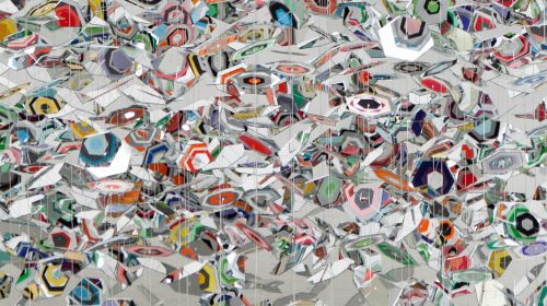 Pae White arbeitet in der Langen Foundation mit äußerst präzisen Setzungen – sie selbst betont im Gespräch die Auseinandersetzung mit der gleichermaßen konzentrierten und großzügigen Architektur von Tadao Andō. Konstitutiv ist die Zweiteilung des Ausstellungsbereiches, im einen Teil zeigt sie ihre Mobiles, im anderen die monumentalen Wandteppiche, die etwa zerknüllte Aluminiumfolie abbilden und, auch von der Rückseite zu sehen, wie ein Labyrinth angeordnet sind. Dieses provoziert das unmittelbare Gegenüber des Betrachters, schafft eigene Raumeinheiten und belegt noch, wie sehr es Pae White versteht, das Publikum zu aktivieren, überhaupt dieses zu verführen.