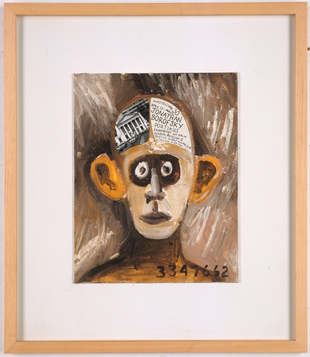 Jonathan Borofsky, o.T. (Entwurf Portikus Plakat/Portrait Kasper König), 1990, Acryl, Fotografie und Schriftmaterial auf Leinwandkarton, 35 x 27,5 cm, © Jonathan Borofsky, Foto: Rheinisches Bildarchiv, KölnAll das klingt in der Präsentation der Kunstwerke an, die er aus dem Berliner (Un-) Ruhestand dem Museum Ludwig geschenkt hat. Oft nicht einmal groß und sogar Bleistiftzeichnungen im kleinen Format, sind sie gedankliche Konzentrate, die über das Insiderwissen hinausgehen, auf Weiteres verweisen und ästhetisch erfahren werden können. Darunter befinden sich neben Werken aus Kunstströmungen wie dem Minimalismus und der Land Art etliche einzelgängerische Positionen, die noch nicht richtig gewürdigt sind. Das beginnt vor dem Ausstellungssaal mit der rudimentär anmutenden Holzskulptur des US-Amerikaners H.C. Westermann, die er Kasper König gewidmet hat. Und nein, das ausgestanzte fotokopierte Porträt von Thomas Hirschhorn zeigt nicht etwa König, sondern den Künstler selbst. Im Saal hängt dann eine Malerei auf Karton zum damaligen Rektor der Frankfurter Städel-Akademie, die Jonathan Borofsky 1990 angefertigt hat: erkennbar immerhin (wie König im Video in der Ausstellung sagt) an den „Henkelohren“. Reizvoll sind die touristischen, 1968 an König adressierten Postkarten von On Kawara, die, rein mit Stempelbuchstaben geschrieben, den Alltag als Existenzversicherung definieren. Nicht minder komplex und erstaunlich sind die Andy Warhol-Replik (die vielleicht gar keine Replik ist) von Elaine Sturtevant oder Henrik Olesens „nachgebaute“ serielle Kuben von Sol Lewitt, der seinerseits zu den von König favorisierten Künstlern zählt. Erst recht in der angenehm dichten Präsentation verweist eins aufs andere und dabei wird klar, dass Kasper König zu jedem Werk noch eine eigene Geschichte auf Lager haben könnte. Also, die Ausstellung ist persönlicher als es scheint. Also, hohe Achtung!