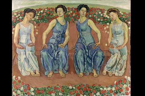 Bei allem Weltfremden vieler seiner Figuren nehmen Hodlers Malereien doch immer Bezug auf ihre Zeit. Die Ausstellung in der Bundeskunsthalle Bonn macht klar, wie sehr der große Schweizer Künstler seine Themen in eine neue, moderne Formsprache übersetzt hat. Dazu trägt sein Gespür für die Darstellung von Bewegung bei. Die Figuren, die fast immer langgestreckt und ausgemergelt und mit wahren Charakterköpfen ausgestattet sind, treten exaltiert und entrückt auf. Sie strecken sich, breiten die Arme auseinander, ein körperlicher Impuls erfasst den ganzen Körper, unterstrichen durch den Gesichtsausdruck. Dazu wendet sich Hodler den entsprechenden Personengruppen zu, zu denen er über die Jahre immer wieder Gemälde anfertigt. Ein Holzfäller schwingt eine Axt. Frauen, die an die anthroposophischen Strömungen ihrer Zeit erinnern und im Bildtitel mit Attributen versehen sind, tanzen oder bewegen sich tastend im Bildraum. Auf einer Bank sitzen fünf Männer gebeugt und in sich versenkt – „Die Lebensmüden“ (um 1892) –, gemalt als extremes Querformat: Mit solchen Gemälden hat Franz Hodler als Hauptvertreter des Symbolismus und des Jugendstils Berühmtheit erlangt. Der Ruhm stellte sich nach und nach ein; vor allem die Ausstellung 1904 in der Wiener Secession hat ihn international bekannt gemacht. In seiner Heimat wurde er 1908 eingeladen, Banknoten zu gestalten, 1920 erhielt er den Ehrendoktortitel in Basel und 1917 eine große Retrospektive im Kunsthaus Zürich. Berühmt ist Hodler bis heute vor allem mit seinen monumentalen Wandmalereien und den oben genannten lebensgroßen Motiven, zu denen noch die Naturdarstellungen mit blühenden Wiesen, Bergen und Seen kommen, die mit ihrem tiefliegenden Himmel in ihrer Leere und Weite eine spirituelle Dimension vermitteln und doch als Orte in der Schweiz identifizierbar sind. Anlass der Bonner Ausstellung, in der all diese Sujets ausgiebig vorgestellt werden, ist der 100. Todestag Hodlers. Aber auch unabhängig davon ist eine Schau seiner Werke fantastisch und sehenswert