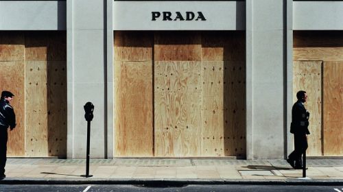 An einem Tag im Jahr verwandeln sich in London die großen Designer-Shops von Prada und Versace, Donna Karan und Chanel in Bretterbuden. Am 1. Mai stehen die großen Demonstrationen an, und dann werden die Fassaden der Geschäfte mit Sperrholzplatten – ähnlich wie beim Rosenmontagszug in Köln – zum Schutz vor Randalierern vernagelt. Man duckt sich weg vor dem Mob der Straße, und im letzten Jahr konnte man ja auch über Tage hinweg im Fernsehen beobachten, warum das so ist. Immo Klink hat seine Fotografien in London schon im Mai 2002 innerhalb von nur drei Stunden aufgenommen. „Mayday at Mayfair“ nennt der ehemalige Anwalt und spätere Assistent von Wolfgang Tillmans seine Serie, in der die Luxus-Marken der westlichen Welt Land unter verzeichnen.