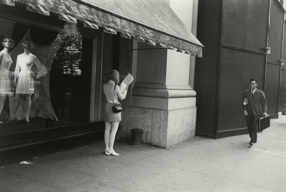 Sensationell ist das Gespür des Fotografen für den richtigen Augenblick inmitten der Passanten auf der Straße, in Geschäften oder Fahrzeugen, aufgenommen bevorzugt in Metropolen wie New York. In einem Bild von Garry Winogrand steht eine Frau im kurzen Rock auf dem Bürgersteig und hat in der rechten Hand eine Zeitung, gleichzeitig kommt ihr ein Mann im Büro-Anzug entgegen. Seine Eile wird durch den erhobenen Fuß deutlich, er selbst hat eine Zeitung unter den Arm geklemmt. Während die Frau vor dem Schaufenster eines Modegeschäftes unter der Markise steht, hat der Mann dunkel verblendete Fassaden im Rücken: Zwei Welten treffen aufeinander.