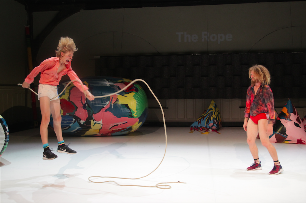 Die Köpfe in den Reihen gehen wie beim Tennis hin und her, folgen dem Joggingweg der beiden Spanier. Dann sind diese aufgewärmt, bleiben voreinander stehen, unterhalten sich. Zwar auf Spanisch, aber sie tun es so körperlich und gestisch, dass man dennoch fast jedes Wort versteht. „The Rope“ heißt ihre nächste Nummer, die Titel dieser „Kapitel“ immer an die Rückwand des Raums projiziert. Völlig überdreht und albern denken sich die Tänzer aus, was man mit einem Seil alles machen kann. Das kindliche Spiel in seiner Reinheit entfaltet sich zwischen wilden Tanzbewegungen und absolutem Nonsens. Irgendwann verstehen das Sprachgewirr nur noch die des Spanischen Mächtigen im Publikum. Doch die lachen Tränen, während der Rest etwas verwirrt auf die völlige Veräußerung auf der Bühne starren.